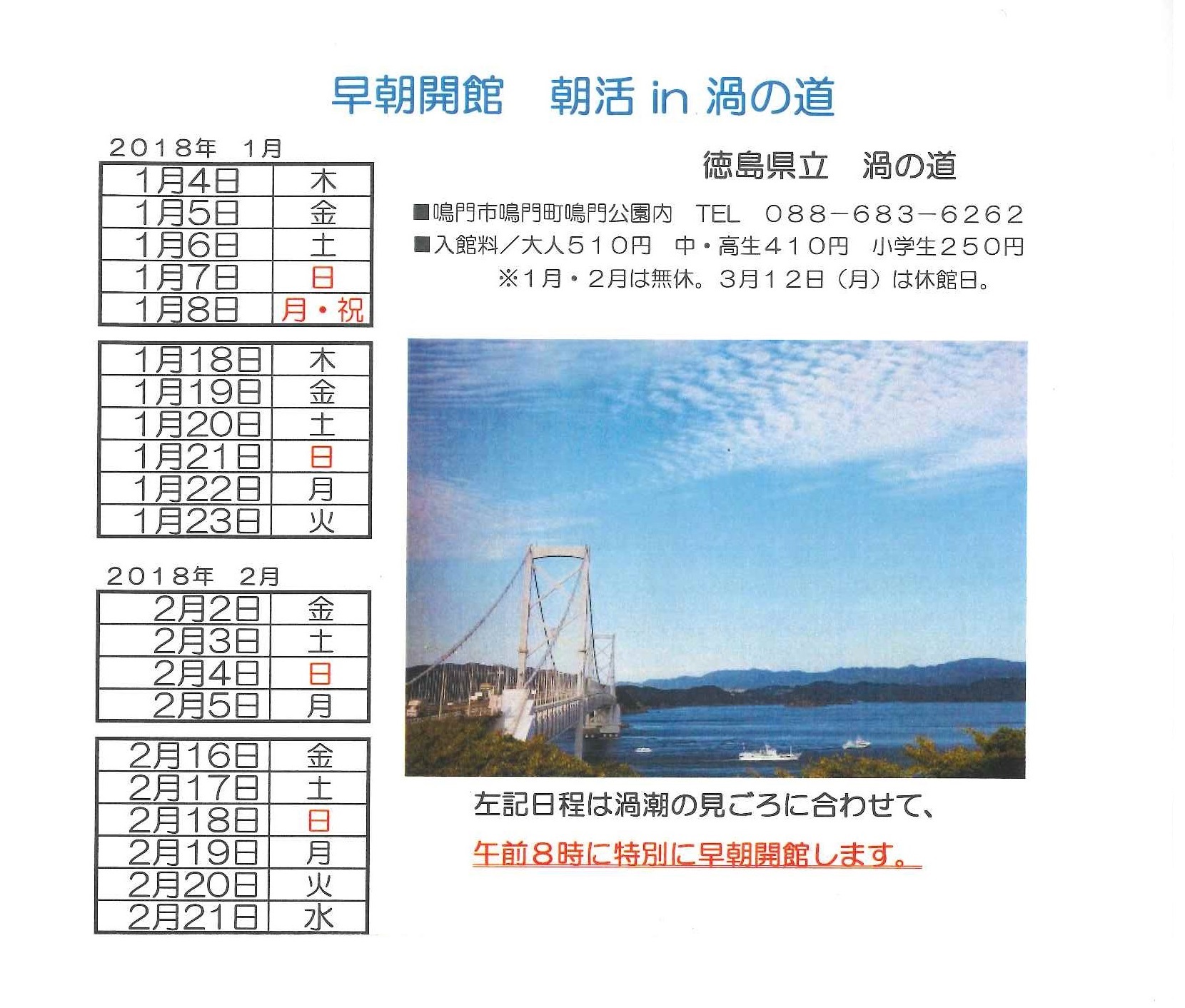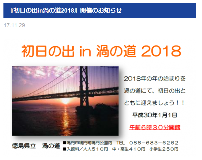 2018年の始まりを渦の道にて、初日の出とともに迎えましょう! ■日時■ 平成30年1月1日(月・祝) 午前6:30開館 ■場所■ 渦の道 鳴門市鳴門町鳴門公園内 TEL:088-683-6262 ■入館料■ 大人 510円 ... |
