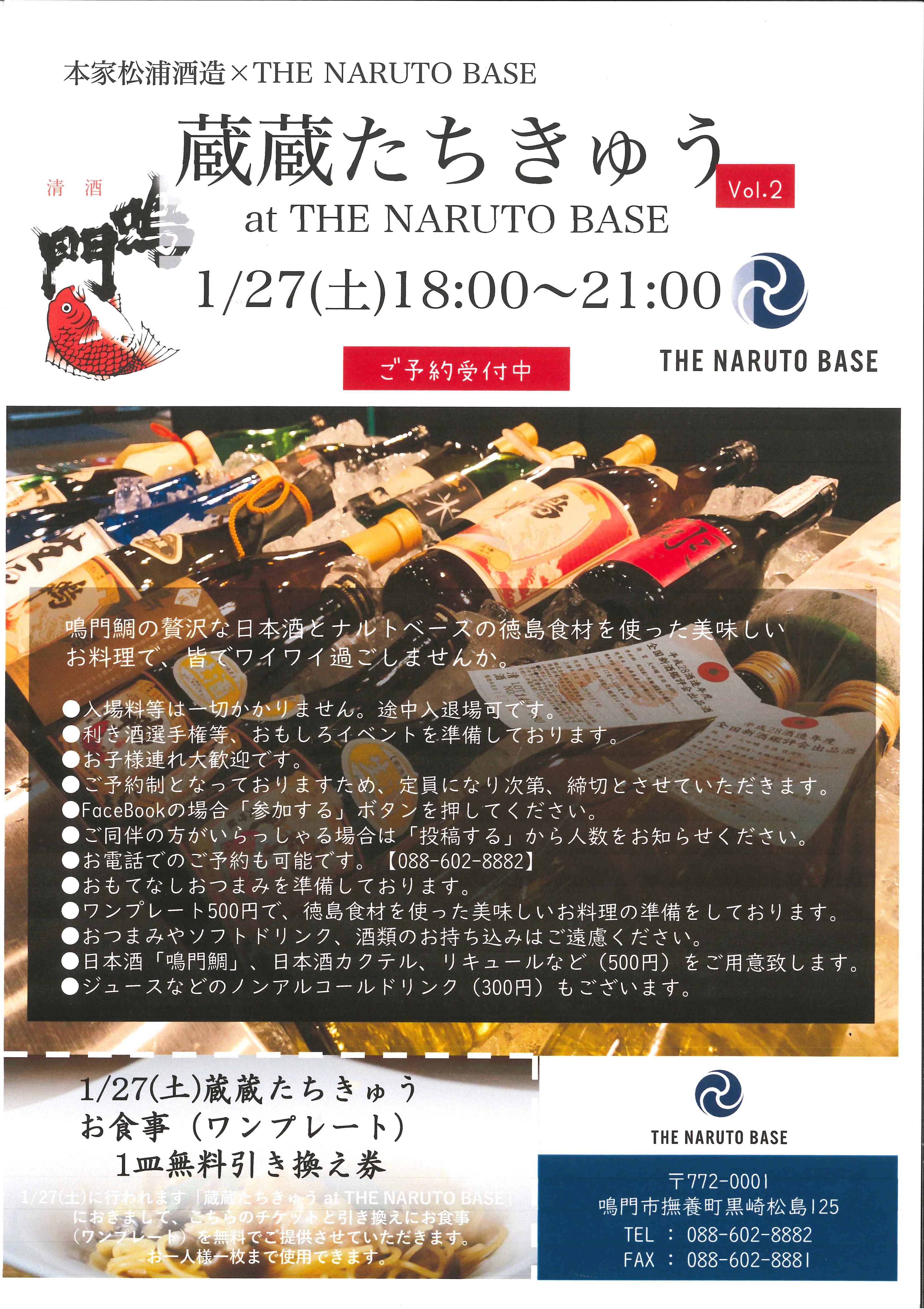 鳴門鯛の贅沢な日本酒とナルトベースの徳島食材を使った美味しいお料理で、皆でワイワイ過ごしませんか? ■日時■ 平成30年1月27日(土) 18:00〜21:00 ■会場■ THE NARUTO BASE 鳴門市撫養町黒崎松... |