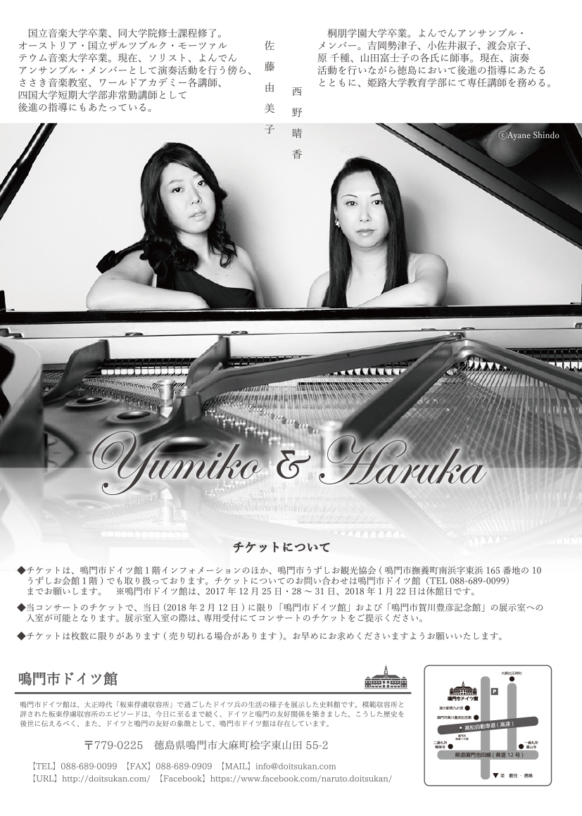 県出身・在住のピアニスト佐藤由美子と西野晴香による、ピアノデュオコンサート。ソロ演奏、連弾のほか、鳴門市ドイツ館のコンサートでは珍しい「2台ピアノ」も披露されます。演奏曲目は主にバッハ、ベートーヴェン、モーツァルトなど、ドイツ出身、またはドイツにゆかりのある作曲家の作品を中心に、構成されています。