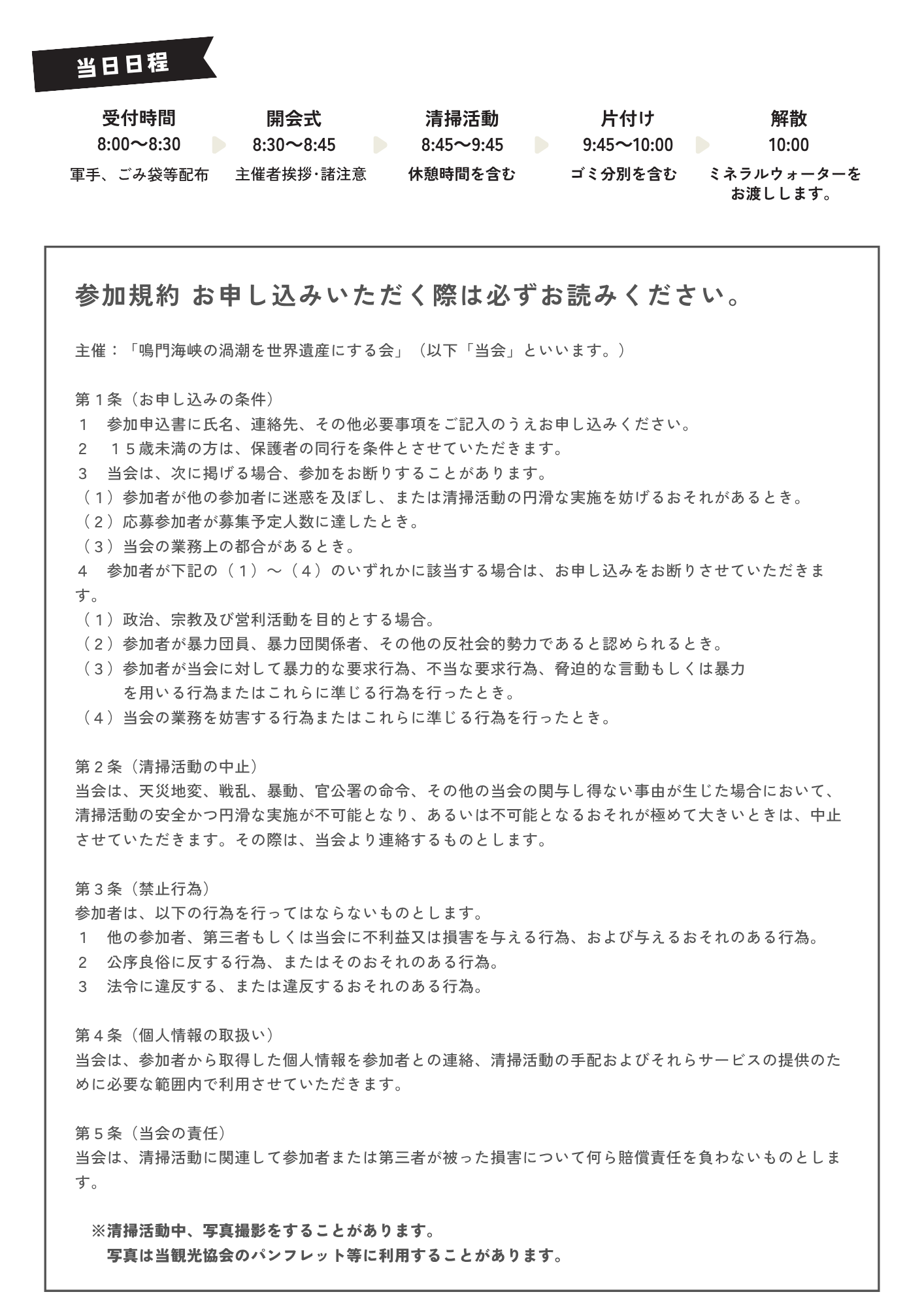 「鳴門海峡の渦潮」の世界遺産化に向けた普及啓発の一環として、鳴門公園海岸線の清掃活動を行います。