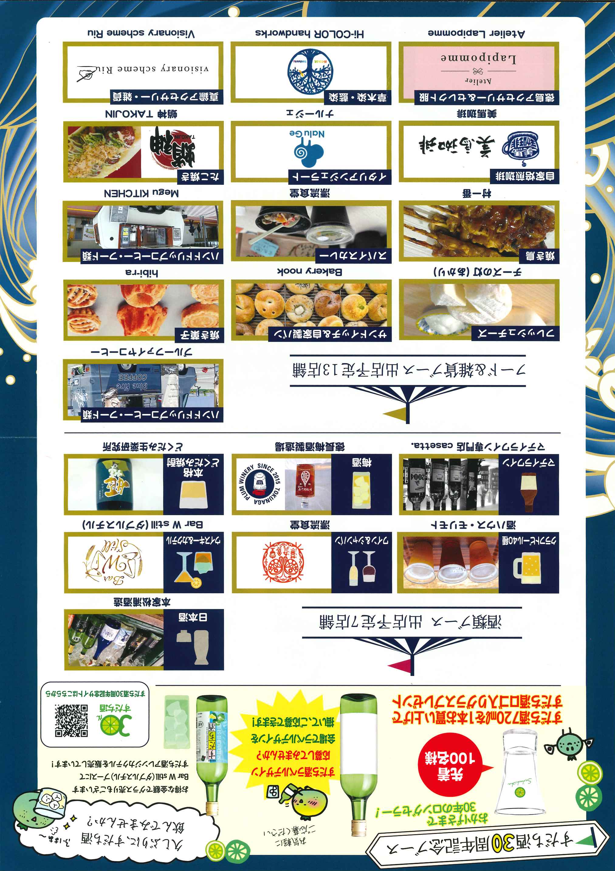 日本酒・ワイン・シャンパン・マデイラ・クラフトビール・ウイスキー・カクテル・梅酒など多彩な酒を各ブースでグラス&ボトル売り。フード出店も充実。